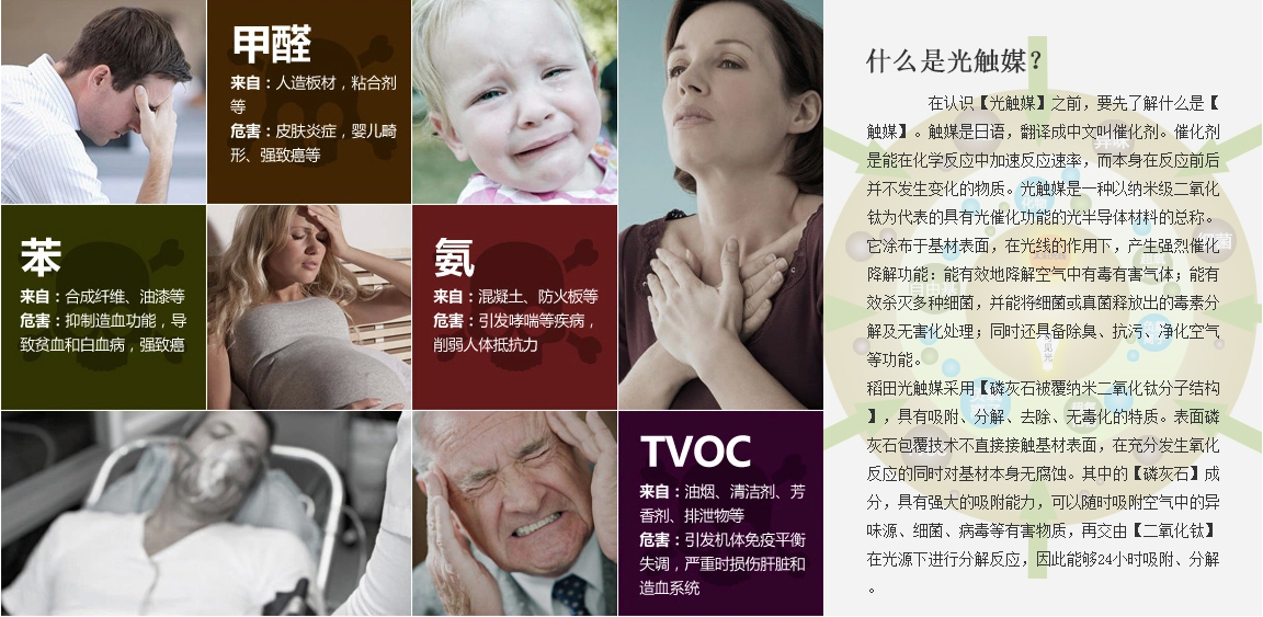 在認(rèn)識(shí)【光觸媒】之前,要先了解什么是【觸媒】。觸媒是日語(yǔ),翻譯成中文叫催化劑。催化劑是能在化學(xué)反應(yīng)中加速反應(yīng)速率,而本身在反應(yīng)前后并不發(fā)生變化的物質(zhì)。光觸媒是一種以納米級(jí)二氧化鈦為代表的具有光催化功能的光半導(dǎo)體材料的總稱(chēng)。它涂布于基材表面,在光線(xiàn)的作用下,產(chǎn)生強(qiáng)烈催化降解功能:能有效地降解空氣中有毒有害氣體;能有效殺滅多種細(xì)菌,并能將細(xì)菌或真菌釋放出的毒素分解及無(wú)害化處理;同時(shí)還具備除臭、抗污、凈化空氣等功能。 稻田光觸媒采用【磷灰石被覆納米二氧化鈦分子結(jié)構(gòu)】,具有吸附、分解、去除、無(wú)毒化的特質(zhì)。表面磷灰石包覆技術(shù)不直接接觸基材表面,在充分發(fā)生氧化反應(yīng)的同時(shí)對(duì)基材本身無(wú)腐蝕。其中的【磷灰石】成分,具有強(qiáng)大的吸附能力,可以隨時(shí)吸附空氣中的異味源、細(xì)菌、病毒等有害物質(zhì),再交由【二氧化鈦】在光源下進(jìn)行分解反應(yīng),因此能夠24小時(shí)吸附、分解